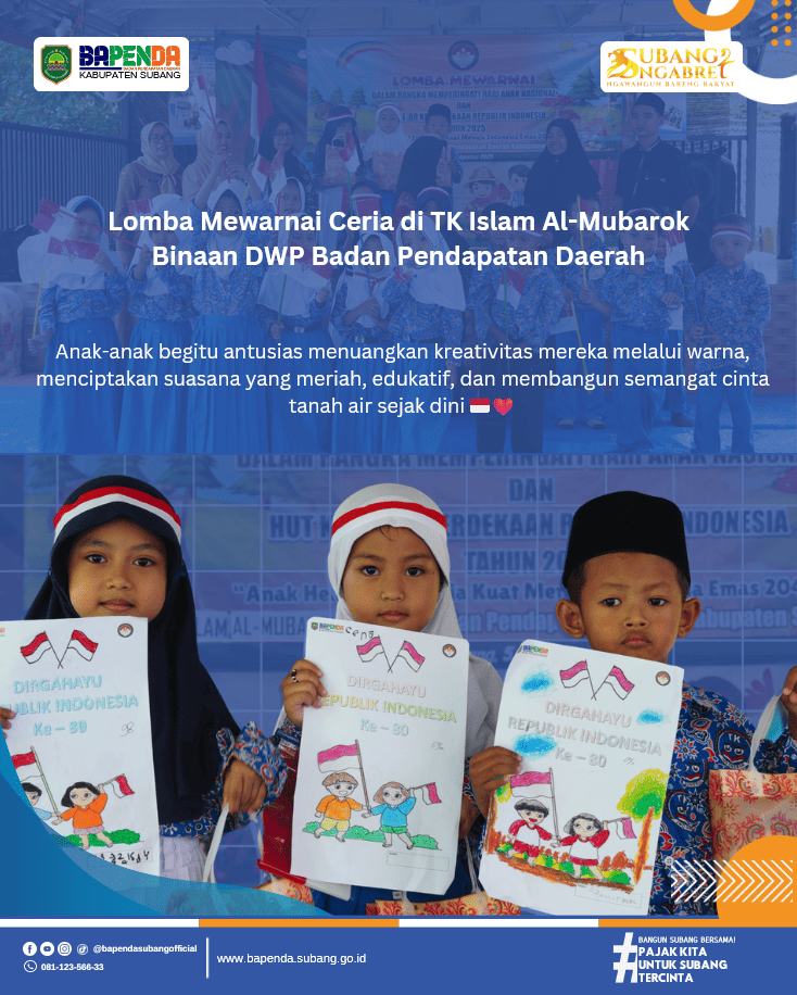 Dalam rangka memperingati Hari Anak Nasional dan HUT ke-80 Kemerdekaan Republik Indonesia, Dharma Wanita Persatuan (DWP) Bapenda Subang menyelenggarakan kegiatan Lomba Mewarnai yang berlangsung meriah di TK Islam Al-Mubarok, salah satu binaan DWP Bapenda Subang.